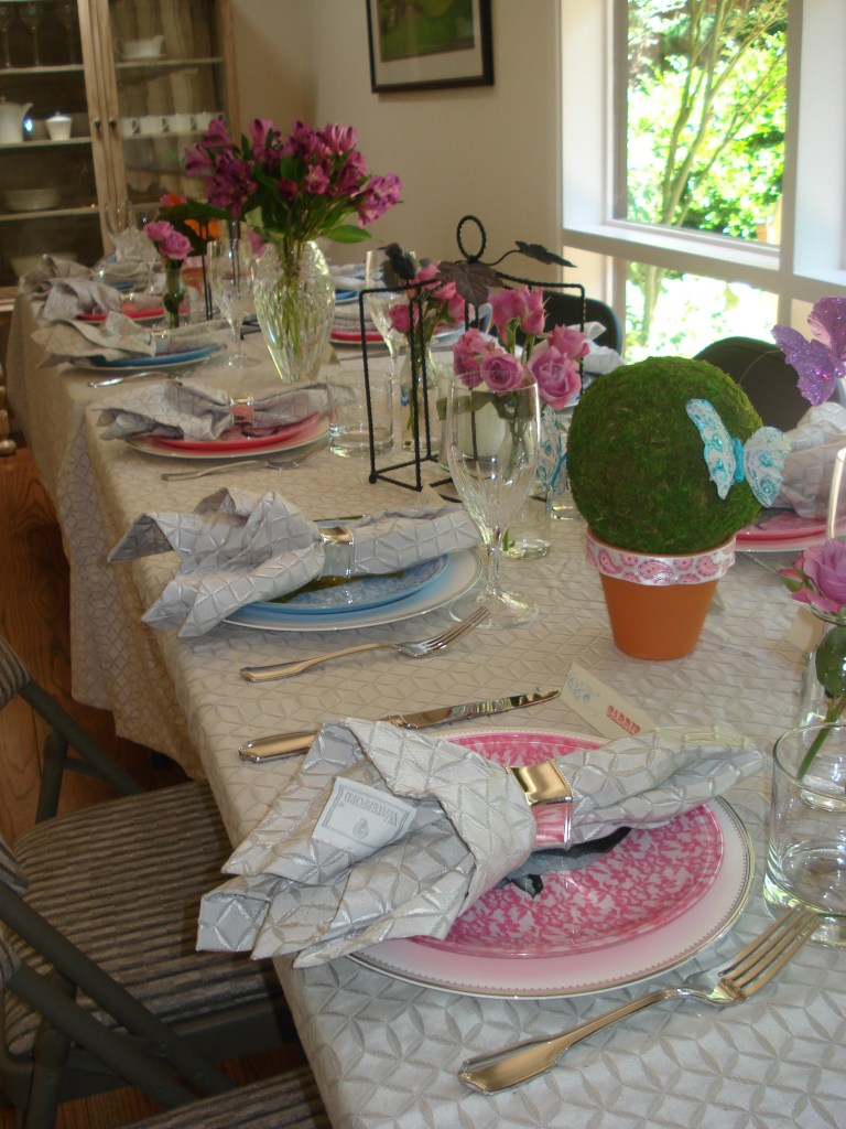 The centerpieces remained natural with lots of fresh flowers in bright colors, wire bird cage candle holders, and topiaries I made by attaching moss balls to terra cotta pots. I attached store bought butterflies to the topiaries and hot glued pink paisley ribbon around their rims to spruce them up a bit.