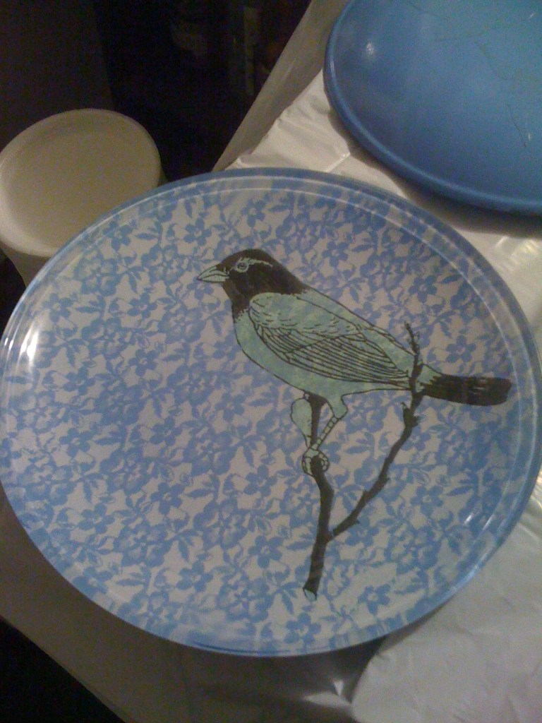 For the dinner plates, I found images of birds on the internet and Xeroxed them onto neon papers at Kinkos. After cutting them out and gluing them to the backside of glass plates. I used lace fabric to as a mask to decorate the back with a pattern. After a lot of experimenting with various color combinations (pink on white, blue on white, pink on blue) and paint types (hint: florescent pink spray paint does not cover well) I settled on colors combined with white. I knew I wanted to alternate colors on the table so I masked all the plates with lace fabric, spray painted them white. I removed the lace and let them dry then painted half of them pink and half of the blue. Aside from the paint bleeding through a few of the birds on the front side, I was ecstatic with the result. Below are examples of the blue plates, both in progress and on the table I neglected to take pictures of any of the pink ones, my bad.