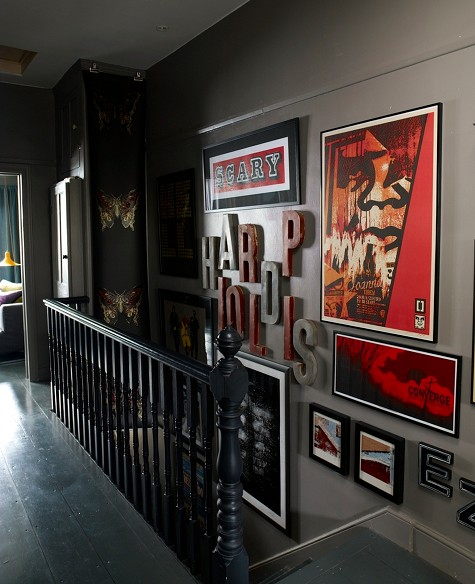 I don’t know what it is about gray rooms, but they make me stop everytime. The butterfly banner at the top of the stairs needs to go though.