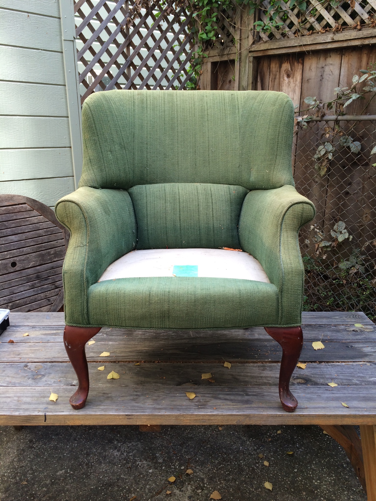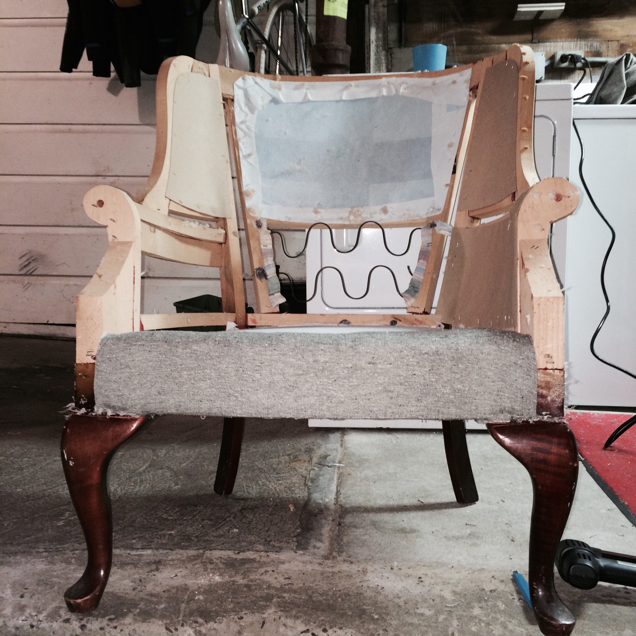 Gloomy day = good day to makeover a chair. I was able to get it torn apart and a new deck put on. Arms and back next.